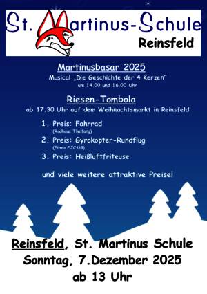 Als besondere Höhepunkte des Martinus-Basars gelten die Auftritte des Schulchores „Reinsfelder Füchse“ mit dem Musical „Wenn der Himmel unser Herz erreicht“ um 14.00 und 16.00 Uhr.